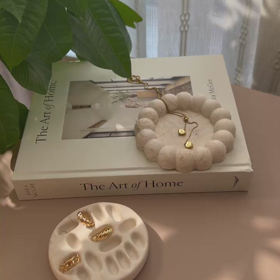 Keep your rings beautifully organized with the Round Rings Holder. Handcrafted from eco-friendly Jesmonite, this elegant holder features a sleek, round design with multiple indentations to keep your rings secure and accessible. The smooth, matte finish and minimalist aesthetic make it a perfect addition to your vanity, nightstand, or bathroom counter.